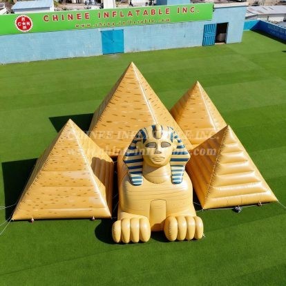 Transport your guests to ancient Egypt with this magnificent Cartoon3-171 Egyptian Sphinx and Pyramids Inflatable Model Product! This stunning inflatable masterpiece features an impressive Sphinx guardian flanked by three golden pyramids, creating an authentic Egyptian landscape that will captivate audiences of all ages.