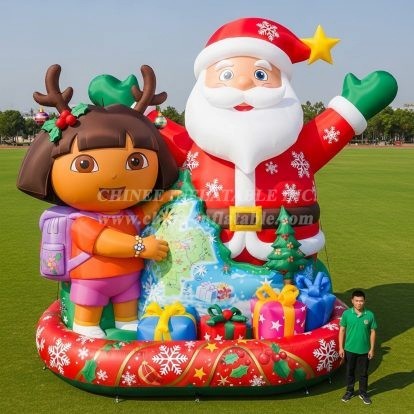 Bring instant holiday magic to your venue with the Cartoon3-543 Christmas Santa and Dora Inflatable Cartoons by Chinee Inflatables. This eye‑catching decorative display features a cheerful Santa with classic red attire and snowflake accents, joined by a friendly young explorer wearing festive reindeer accessories. A swirl of gift boxes, stars, and seasonal graphics completes the scene, creating an irresistible photo backdrop for malls, town squares, school fairs, theme parks, and corporate winter events.