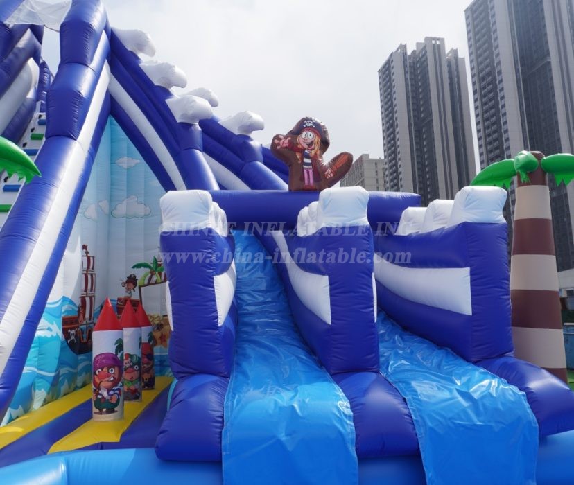 🏴☠️ The Pirate Wave: The main attraction! A monstrous, multi-lane water slide themed as a giant wave, commanded by a pirate captain at the peak. It includes multiple climbing lanes and fast-flowing slides for epic races down into the pool.