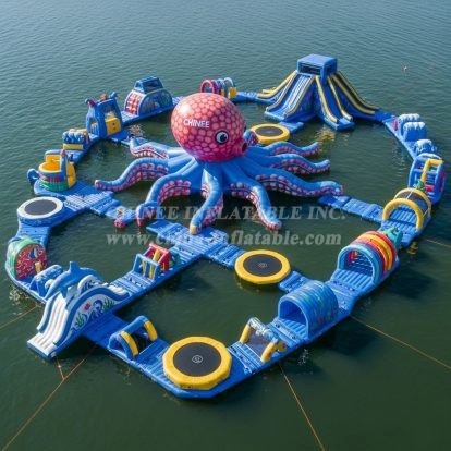Make a splash with the S296 Octopus Theme Water Park by Chinee Inflatables Inc., the leading inflatable manufacturer in China since 1998. Designed for lakes, calm seaside bays, or large pools, this striking floating park is dominated by a giant friendly octopus centerpiece and a maze of connected modules that invite guests to climb, slide, bounce, and race across the water.