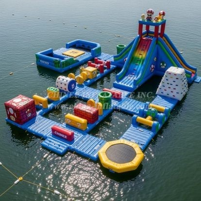 Bring the thrill of an arcade adventure to the water with the S326 Super Mario Water Park by Chinee Inflatables. This floating attraction transforms lakes or calm seaside areas into a colorful challenge course featuring signature elements inspired by classic platform worlds—towering rainbow slides, coin blocks, pipes, and playful mushroom motifs. Guests can dash across balance beams, scramble over soft obstacles, scale the climbing wall, and finish with a splash down the wide slide. Strategic rest zones and transfer platforms make the course approachable for families while still exciting for teens and adults.