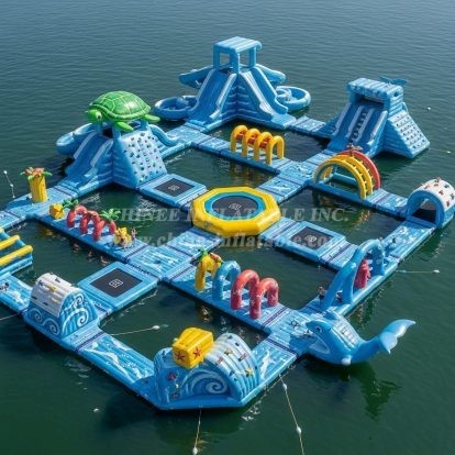 Make a splash with the S349 Ocean Theme Water Park from Chinee Inflatables Inc., a sprawling floating adventure designed for high‑capacity fun and all‑day excitement. This modular aqua park features multiple climbing towers, sweeping slides, balance beams, and jump zones linked by stable walkways, all styled in cool ocean blues with playful marine details like a smiling dolphin bow and tropical palm accents. Guests can scale the climbing walls, race through arch tunnels, bounce on integrated tramp sections, and plunge down thrilling slides into the water—perfect for waterfront resorts, lakes, camps, and rental operators seeking a show‑stopping attraction.