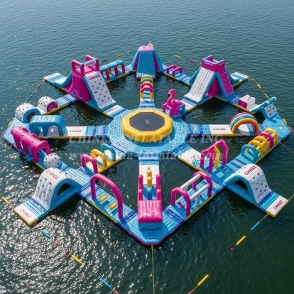 Make a splash with the S380 Rainbow Flamingo Water Park from Chinee Inflatables Inc., a show‑stopping floating adventure zone designed for resorts, camps, and waterfront venues. This vibrant modular park features a central hub connected to multiple challenge arms, creating a 360‑degree course packed with slides, climbs, tunnels, balance beams, and a bouncing/trampoline platform for big airtime before splashdowns. Colorful rainbow arches and a playful flamingo centerpiece add instant visual appeal that draws crowds and looks fantastic in photos and videos.