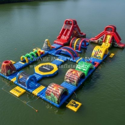 Turn your waterfront into a headline attraction with the S393 Volcano Theme Water Park from Chinee Inflatables Inc. This modular floating course blends towering slides, arched crawl-throughs, balance logs, and splash zones into a vivid volcano-and-jungle adventure. Multiple approach ramps guide guests onto the circuit, where they can climb, slide, and dash across interconnected obstacles that encourage friendly competition and nonstop fun.