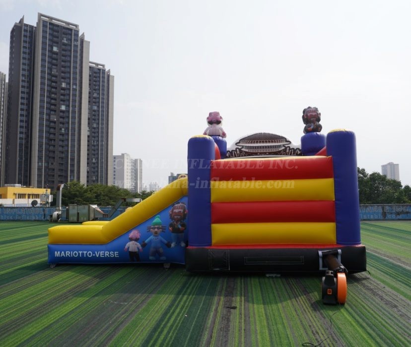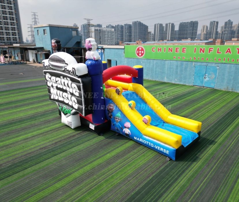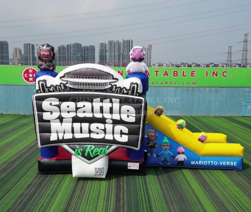 Welcome to a masterclass in brand activation with this fully custom bounce house and slide combo, designed and manufactured by Chinee Inflatables. This project was a unique creation for the “Seattle Music is Real” and “MARIOTTO-VERSE” brands, turning their distinct digital art and branding into a massive, interactive experience.