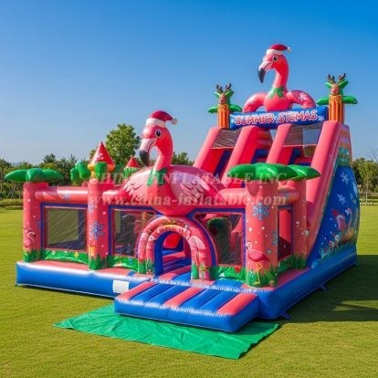Bring festive fun to your next event with the T2-8624 Flamingo Christmas Theme Inflatable Combo from Chinee Inflatables. This vibrant piece blends a spacious bouncing area with a tall dry slide, wrapped in playful flamingo characters wearing Santa hats, palm trees, snowflakes, and bright seasonal graphics. It is a true crowd-pleaser for school fairs, community celebrations, and rental fleets looking for a unique holiday attraction with tropical flair.