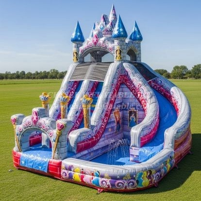 Bring storybook magic to your next event with the T8-8764 Princess Castle Inflatable Water Slide. Designed by Chinee Inflatables Inc., this show‑stopping unit features towering turrets, jewel‑tone artwork, and a sweeping dual‑lane slide that tumbles into a splash area with refreshing water sprayers. The castle façade, crowns, and elegant trim create an instant centerpiece that delights kids and draws crowds to parties, fairs, school fundraisers, and rental fleets.