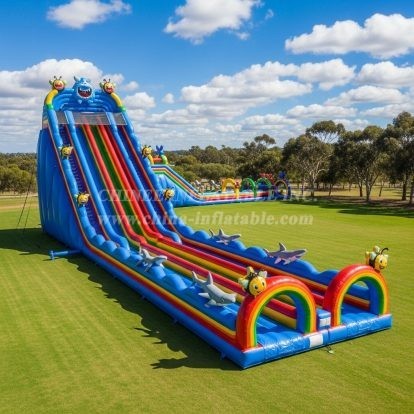 Experience thrilling fun with the T8-8841 Bee and Shark Theme Giant Slide by Chinee Inflatables Inc.! This vibrant inflatable features soaring multi-lane slides decorated with cheerful bees, fierce sharks, and colorful rainbow arches. Perfect for large outdoor events, its eye-catching design and massive scale guarantee excitement for all ages. Built with top-quality materials, this giant slide ensures durability and safety for endless hours of entertainment.