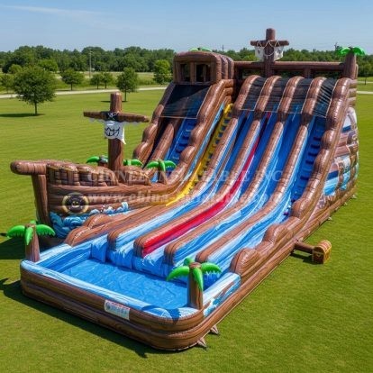 Experience thrilling aquatic adventures with the T8-8982 Pirates Inflatable Water Slide! Designed as a grand pirate ship, this slide features vivid ocean-themed artwork, palm trees, and multiple sliding lanes for maximum fun. Perfect for outdoor events and water activities, it offers safe, durable construction and eye-catching pirate details. Bring the excitement of the high seas to your next party with this premium inflatable from Chinee Inflatables Inc.