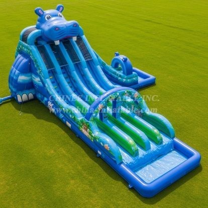 Make a splash with the T8-9006 Hippo Inflatable Water Slide from Chinee Inflatables! Featuring a fun hippo design and vibrant ocean-themed graphics, this giant slide delivers exhilarating rides for kids and families. Perfect for outdoor events, water parks, or backyard fun, its wide lanes and durable construction ensure safe and exciting play. Built with premium materials, it offers long-lasting enjoyment and eye-catching appeal for any aquatic adventure.
