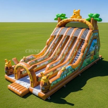 Experience the joy of this vibrant Winnie the Pooh Inflatable Slide, featuring multiple lanes for double the fun. Designed with charming Pooh Bear decorations lush jungle-themed artwork, it creates an inviting atmosphere for kids to slide and play safely outdoors. Perfect for parties, events, or amusement areas looking for a cheerful, family-friendly attraction.