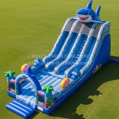Dive into fun with this thrilling shark-themed inflatable water slide. Featuring a bold shark figure the top and vibrant underwater decorations, this slide offers an exciting aquatic experience for kids. Perfect for summer fun and adding a splash of adventure to any outdoor event.