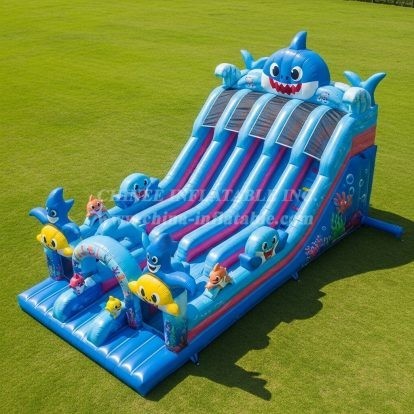 Dive into fun with this vibrant Baby Shark Inflatable Water Slide, featuring multiple lanes and cheerful sea creatures. Perfect for outdoor parties and water play, its ocean-themed design captivates kids and encourages active, thrilling sliding adventures under the sun.