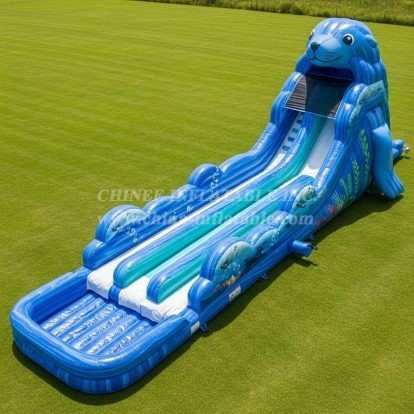 Bring ocean fun to any event with this Sea Lion Inflatable Water Slide. Featuring twin sliding lanes, a shallow splash pool, playful sea-animal graphics and a large sea lion head canopy, it delivers thrilling but safe rides for kids. Built from durable, commercial-grade PVC with reinforced seams and safety netting, it’s perfect for backyard parties, rentals and water park attractions.