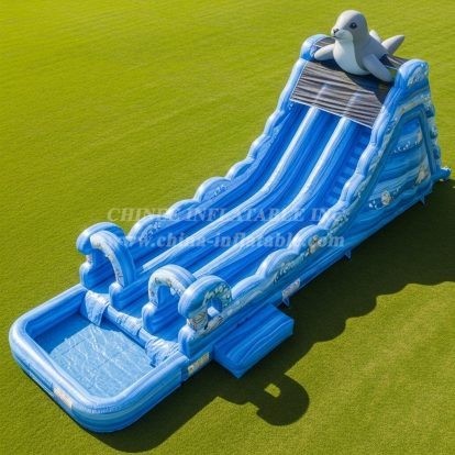 Make a splash with this Seal Top Inflatable Water Slide! Featuring twin lanes, wave-shaped sidewalls and a playful seal topper, the blue ocean-themed slide delivers thrilling, safe rides into a shallow splash pool. Built from heavy-duty PVC with reinforced seams and anchor points, it's perfect for parks, events and backyard rentals. Easy to set up and UV-resistant for long-lasting fun.
